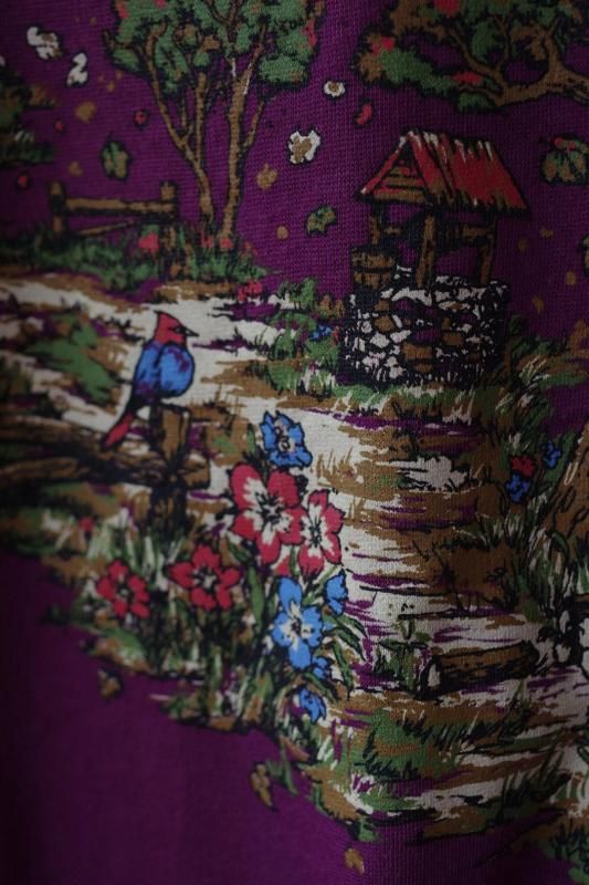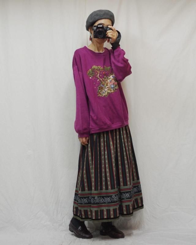 首元のリブが二重になったパープルのスウェットシャツ。