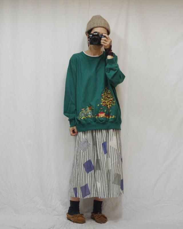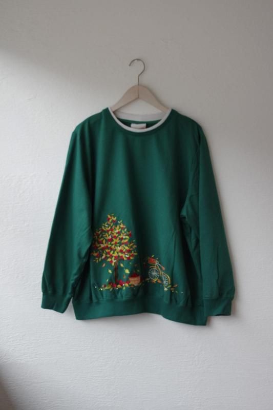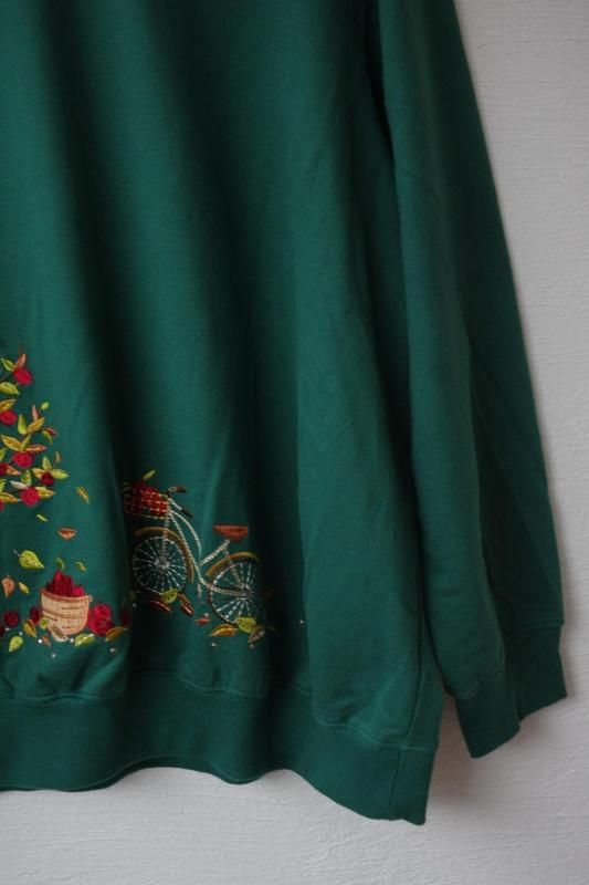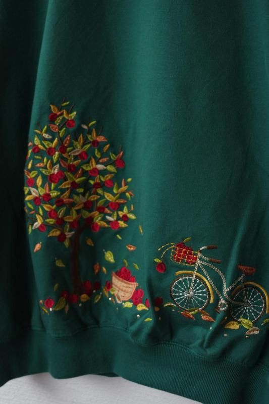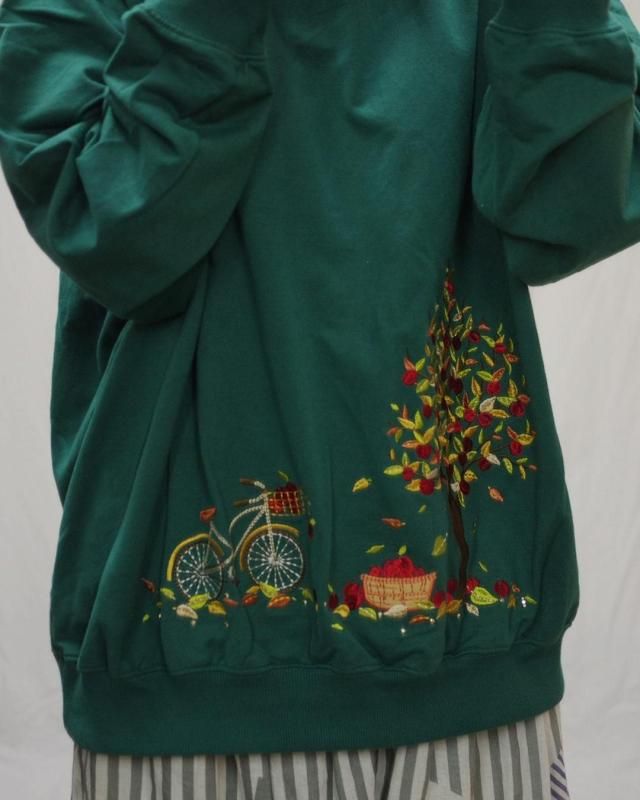 赤い実のなる木と自転車が描かれた秋らしい風景は刺繍であしらわれています。