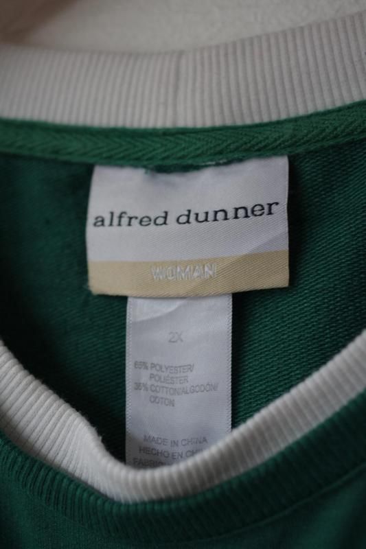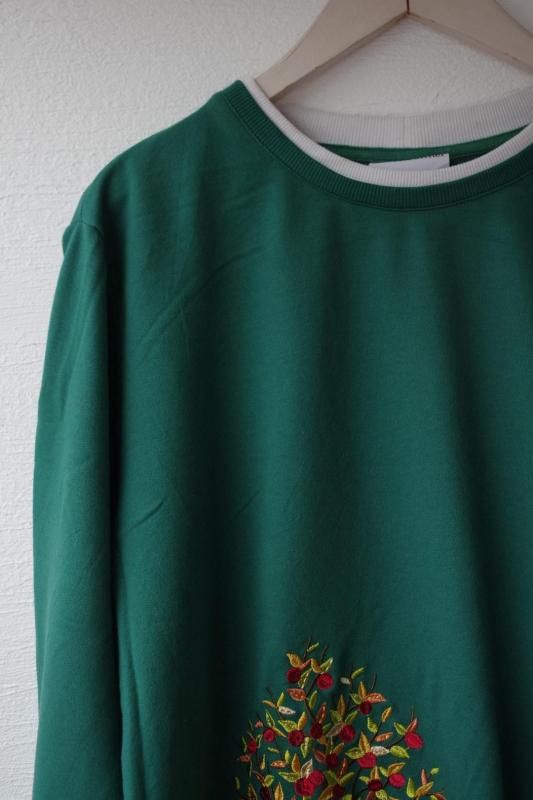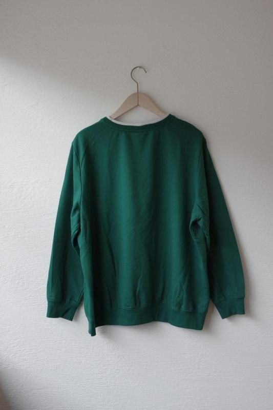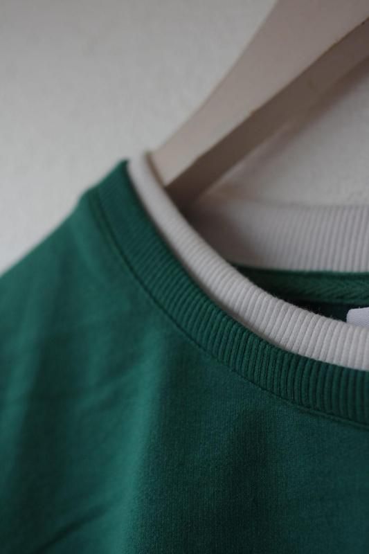 首元のリブが二重になったグリーンのスウェットシャツ。