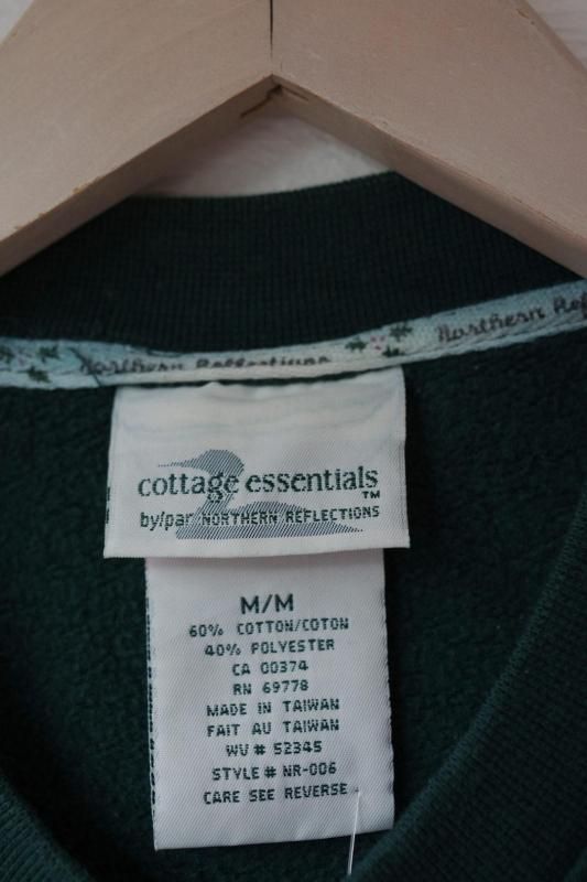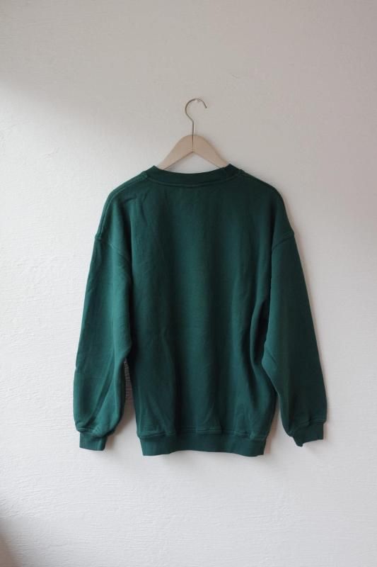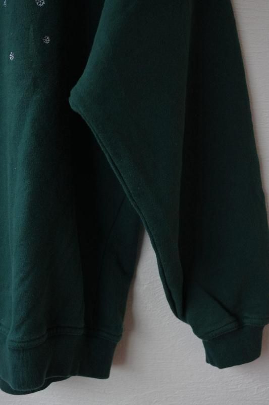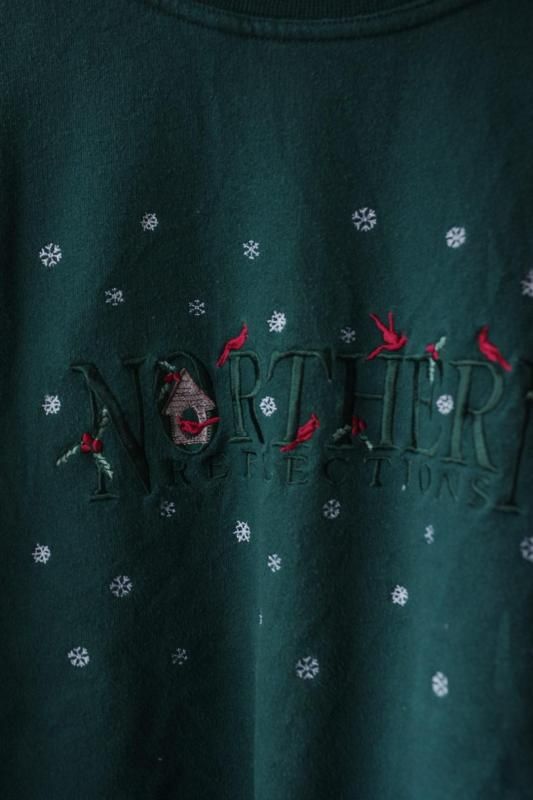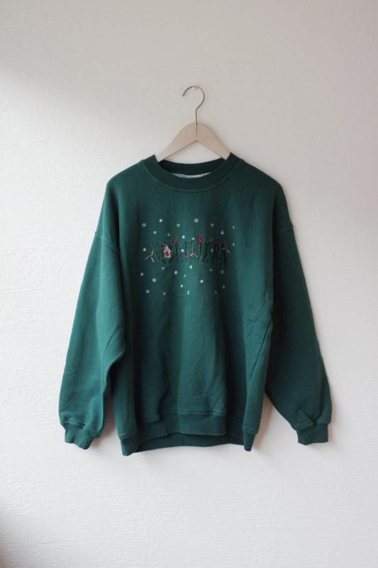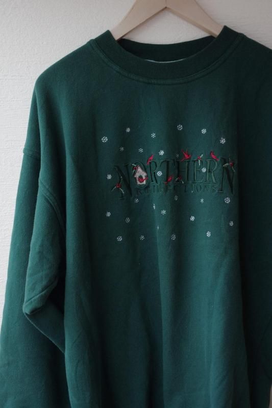 グリーンのボディーにブランドロゴと赤い鳥や巣箱、雪の結晶の刺繍があしらわれたスウェットシャツ。
