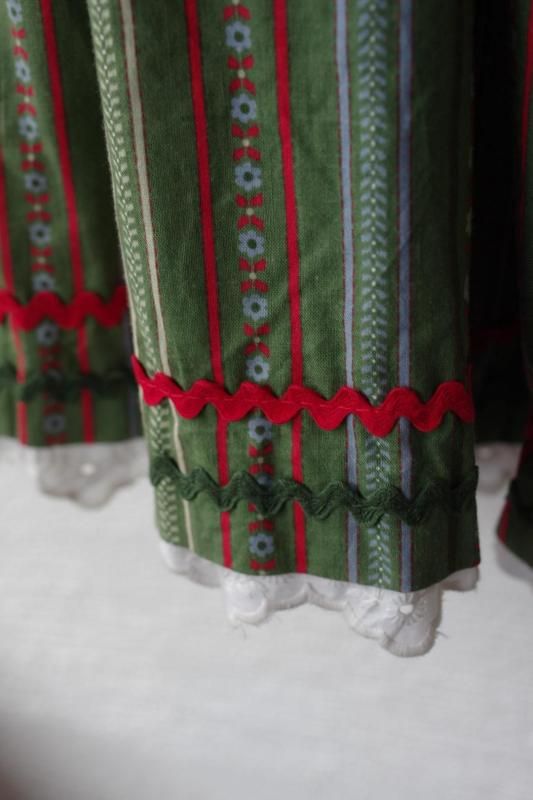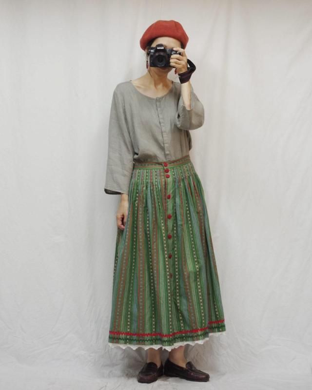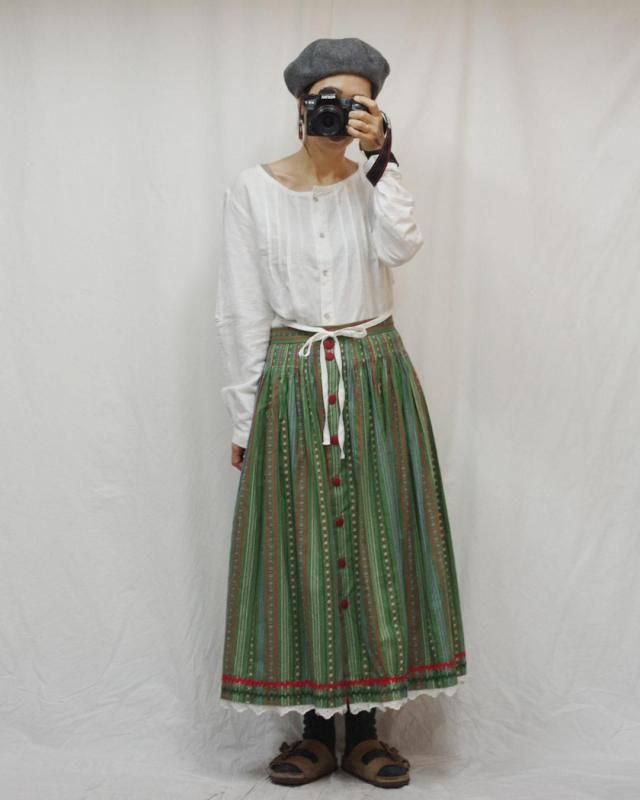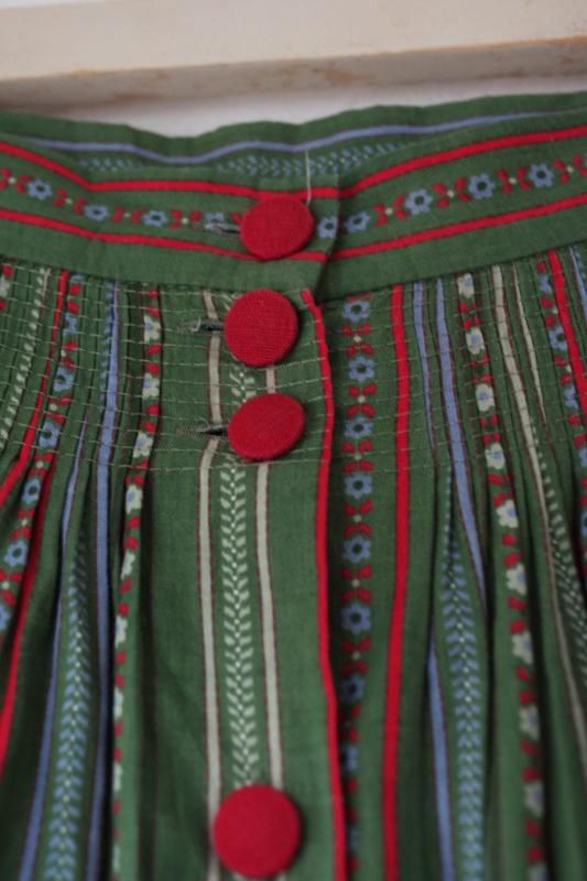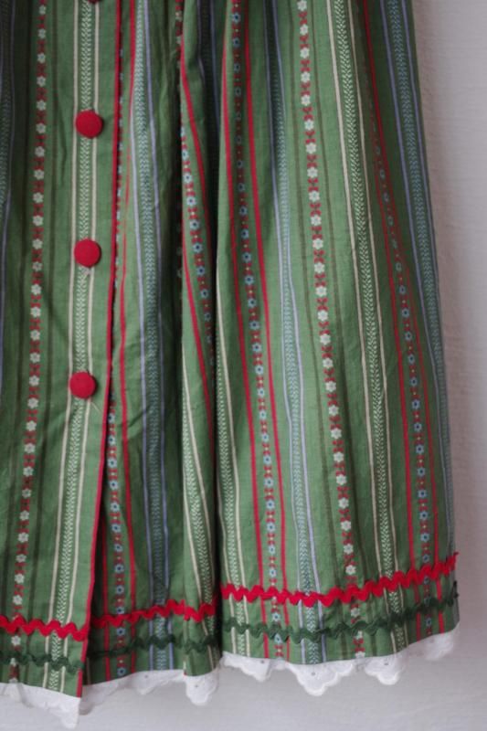 グリーンに小花柄があしらわれたストライプ模様のテキスタイルと裾にはレース、赤いボタンも目を惹きます。