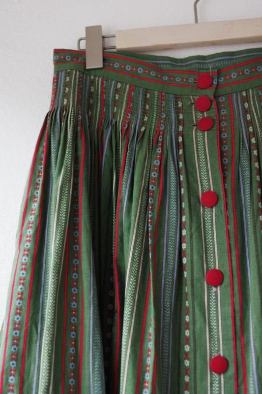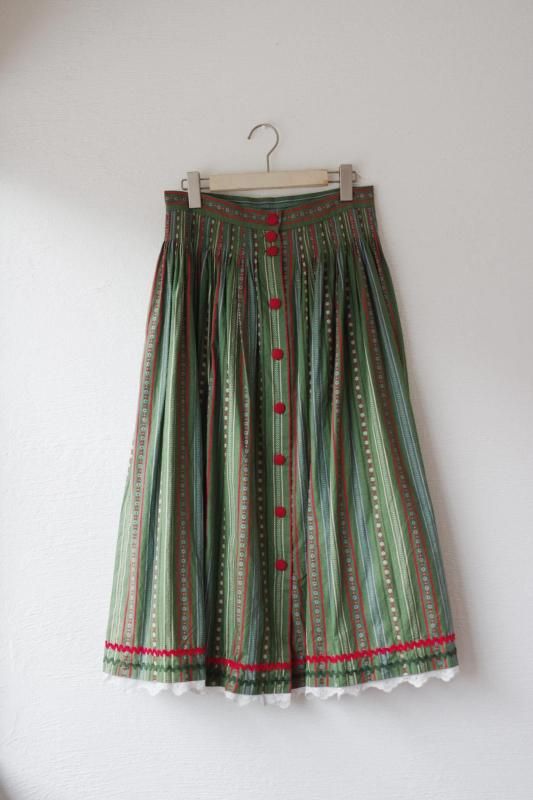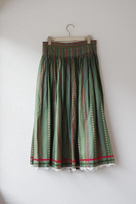 ウエストから裾にかけて広がるシルエット、シャーリングやレースが施された手の込んだ作りが特徴のチロル地方の伝統的なチロルスカート。