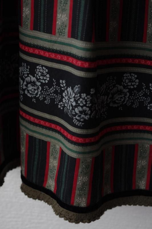 ブラックと赤のストライプで裾にはモノトーンのお花柄、大人でも着やすいタイプの一枚。