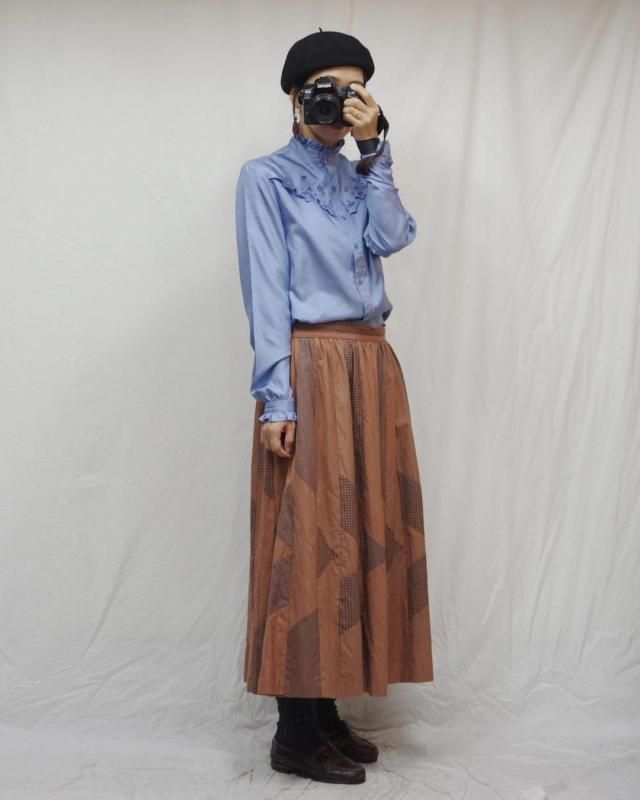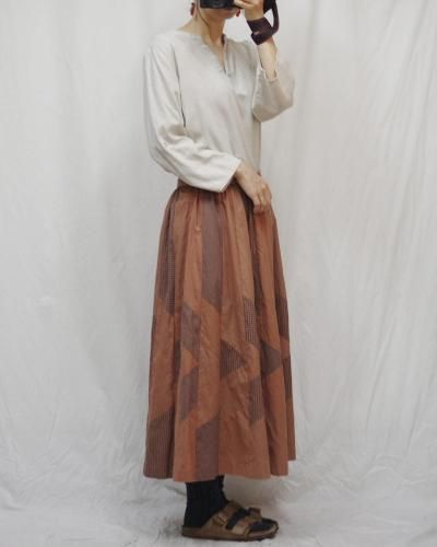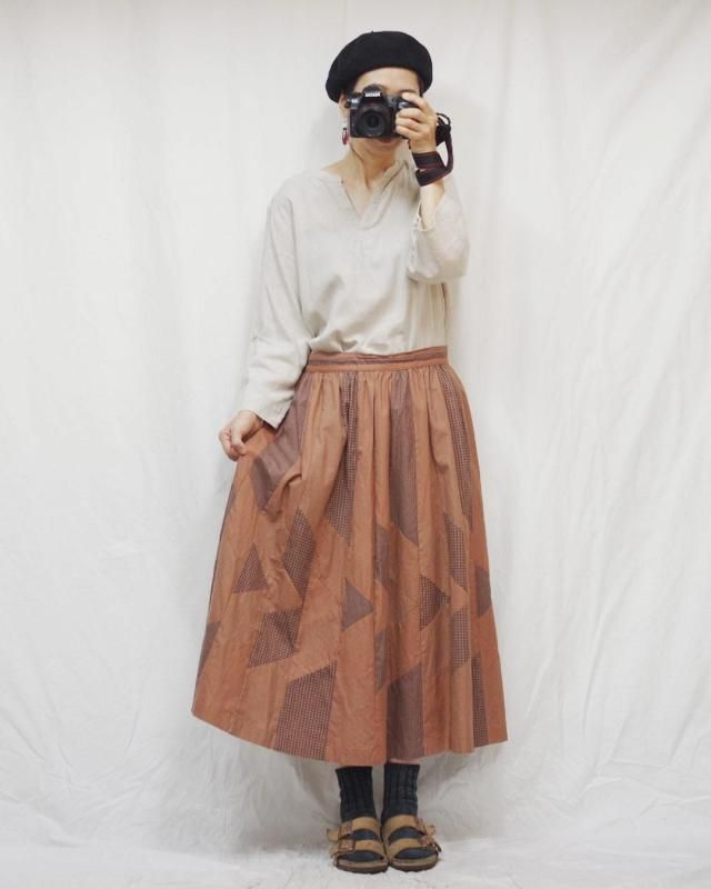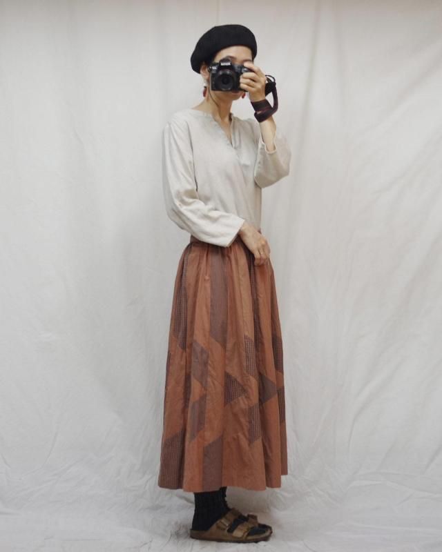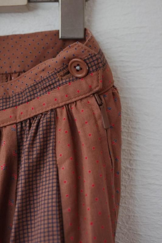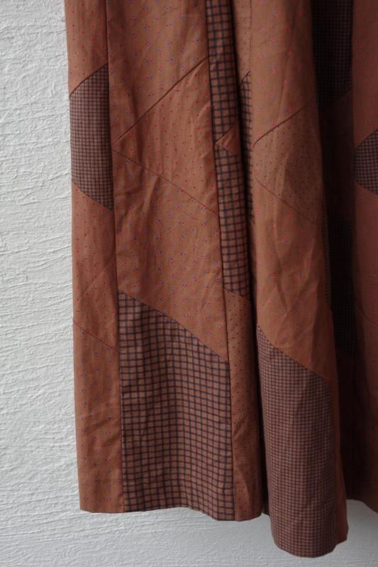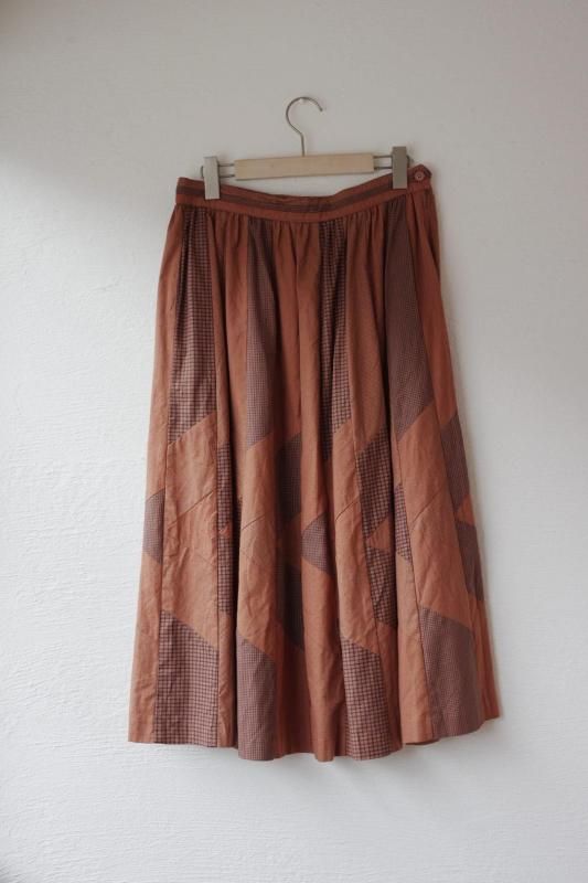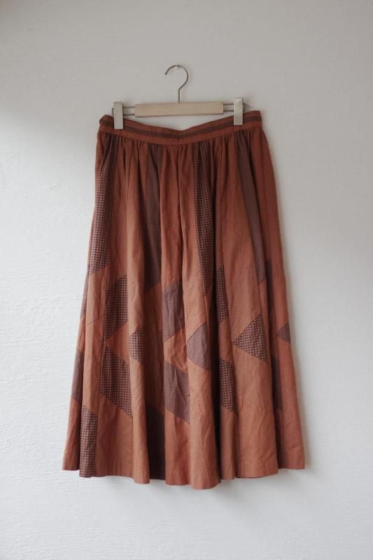 チェックや花柄やドットの生地が組合わせられたパッチワークのスカート。