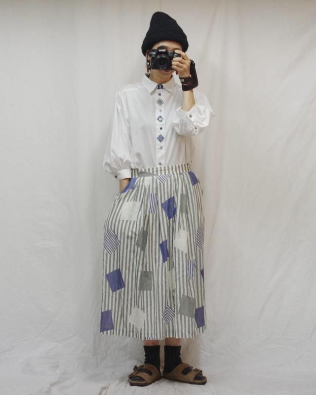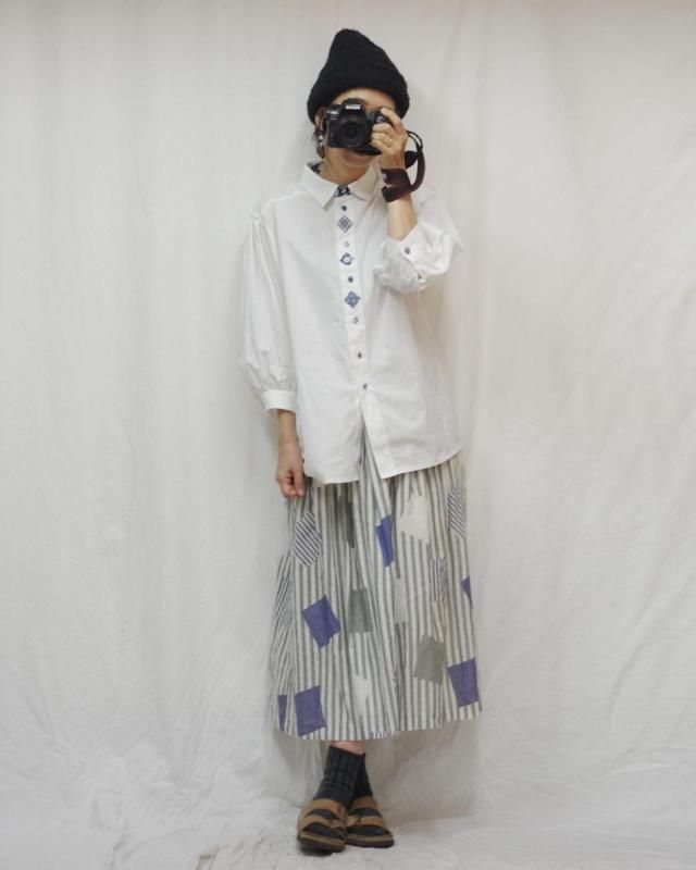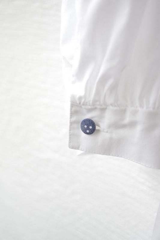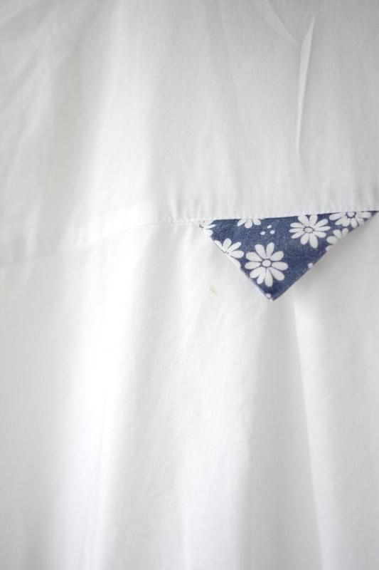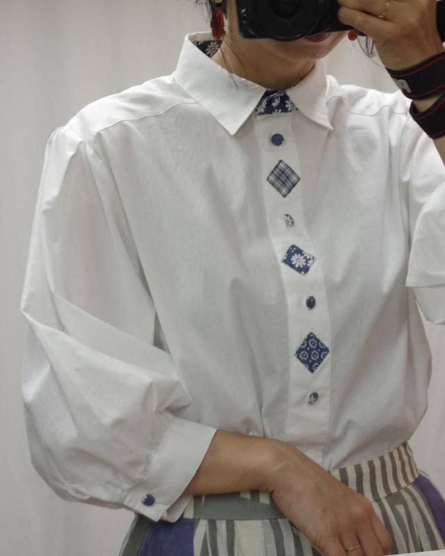 白いブラウスシャツに花柄やチェックの生地のパッチワークとくるみボタンがキュートな一枚。
