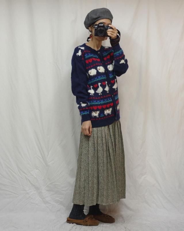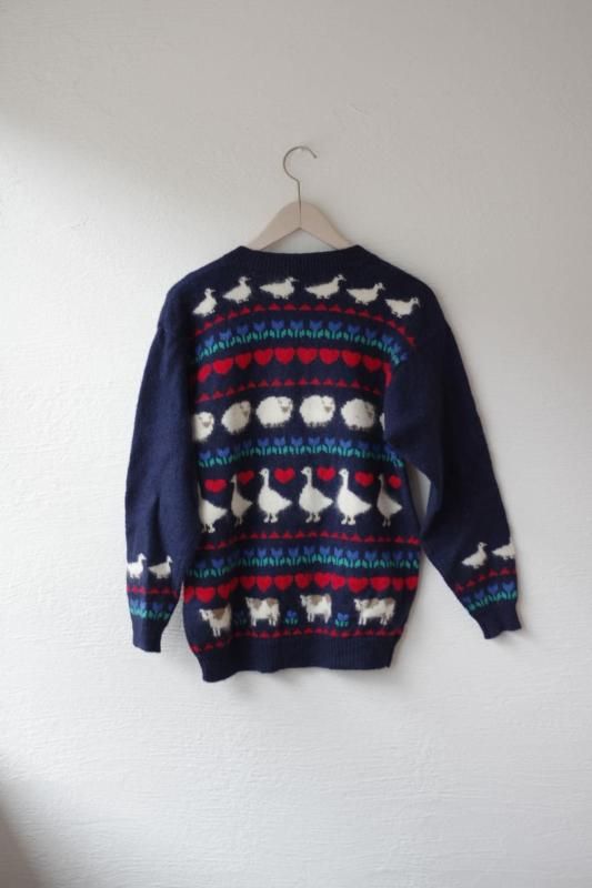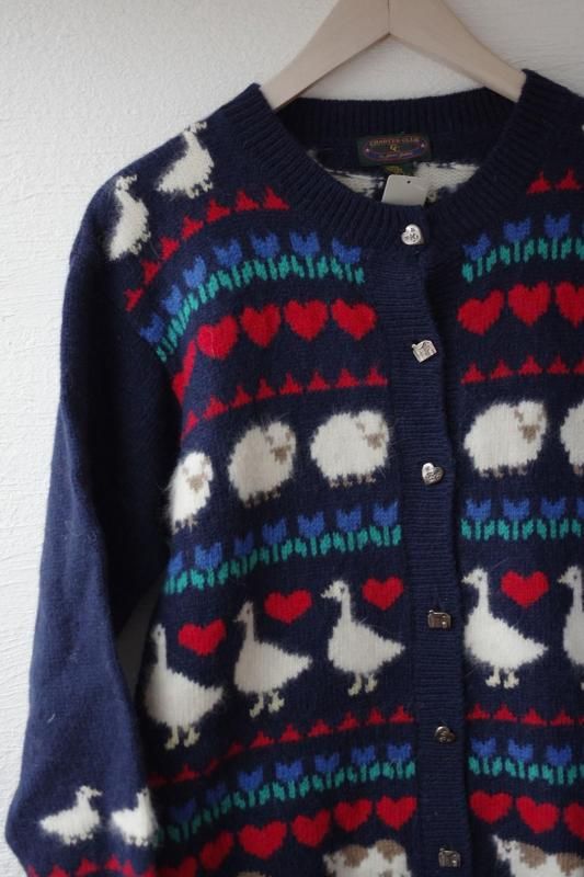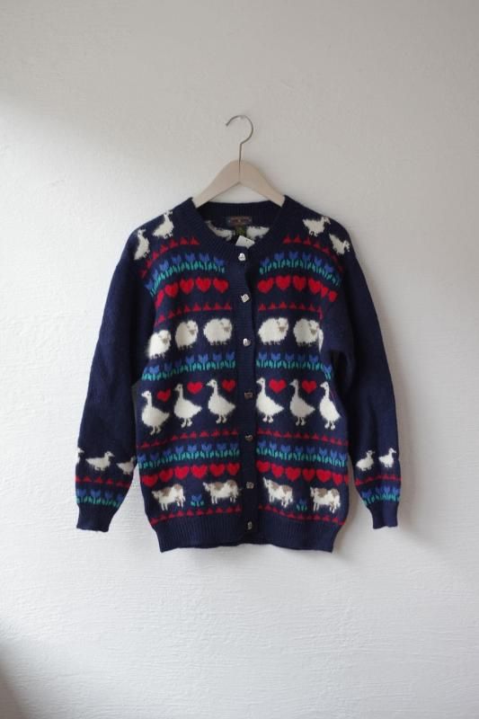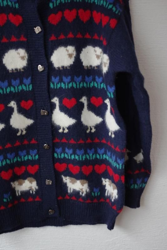 ネイビーをベースにトリ・カモ・ヒツジ・ウシなどのどうぶつとお花やハートがが並んだデザインのカーディガン。