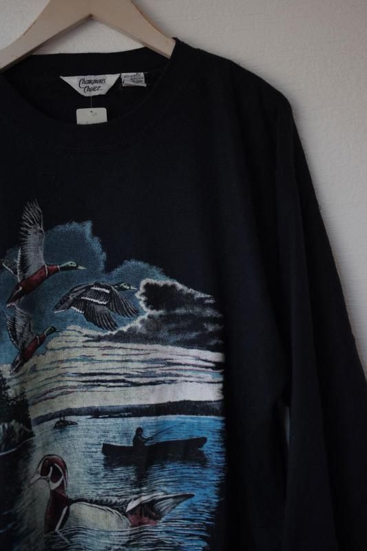 湖に浮かぶカモ、空を飛ぶカモ、釣り人を乗せた一艘の船に対岸。