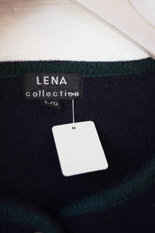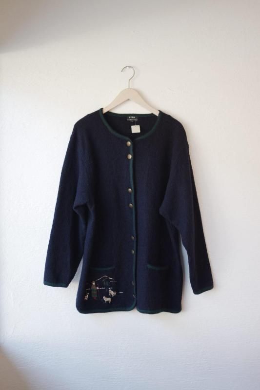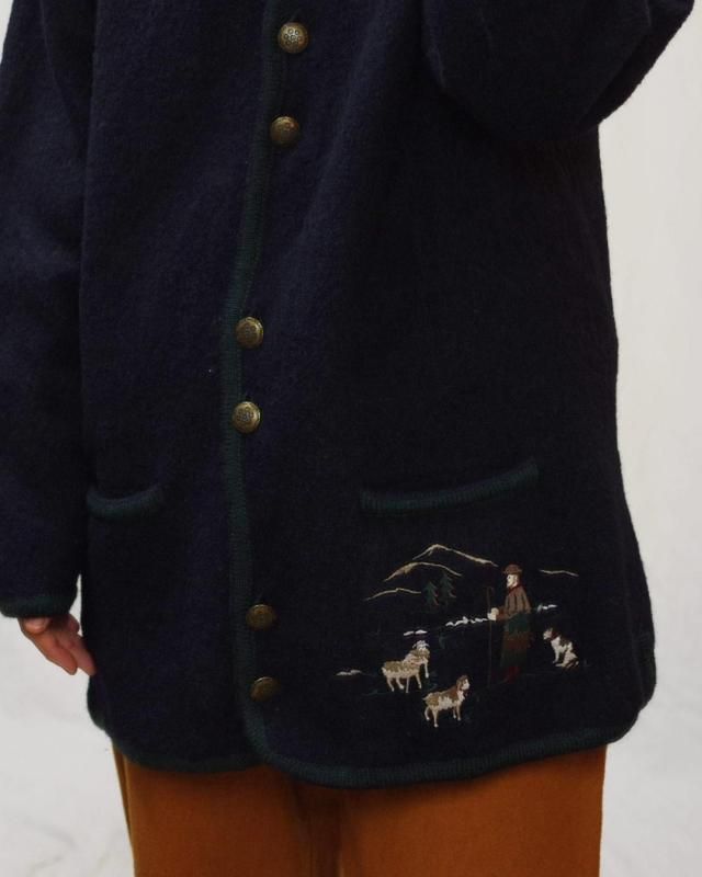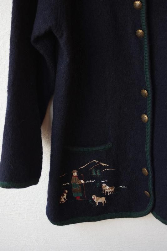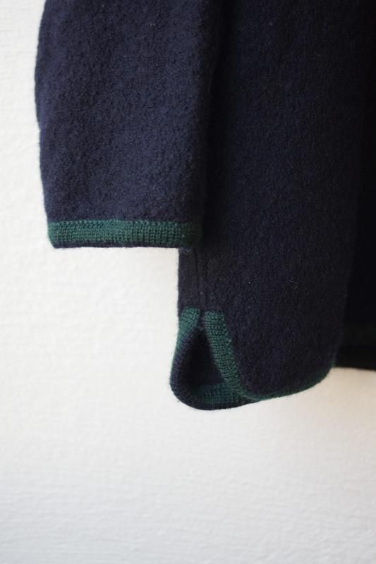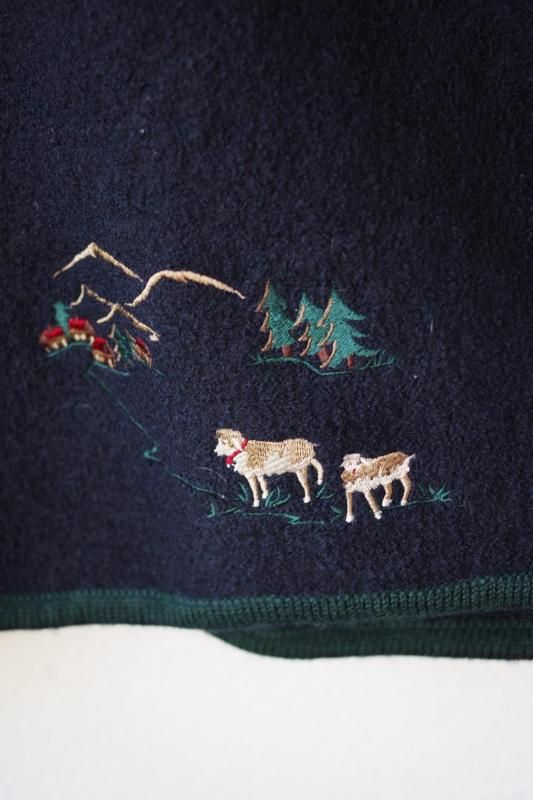 ネイビーのベースにグリーンのパイピングがあしらわれ、更にポケットに牧歌的な刺繍と唯一無二の存在感。