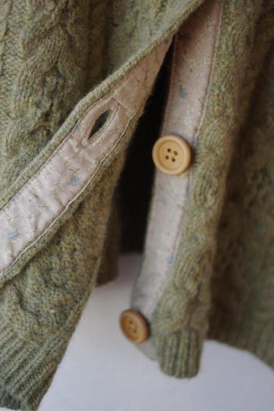ベーシックなケーブル編みのニットで、前立てにはお花柄の生地があしらわれているのが特徴的。とってもキュートな一枚です。