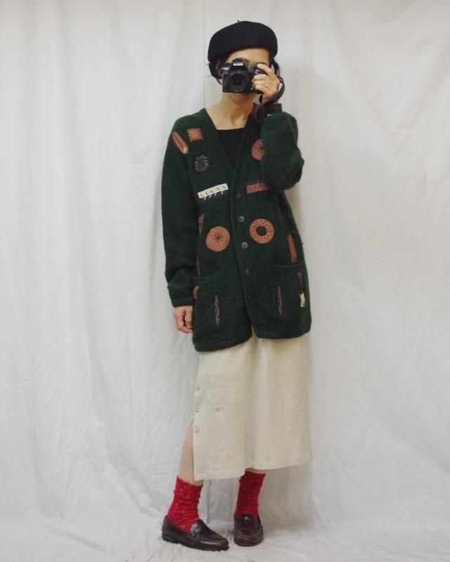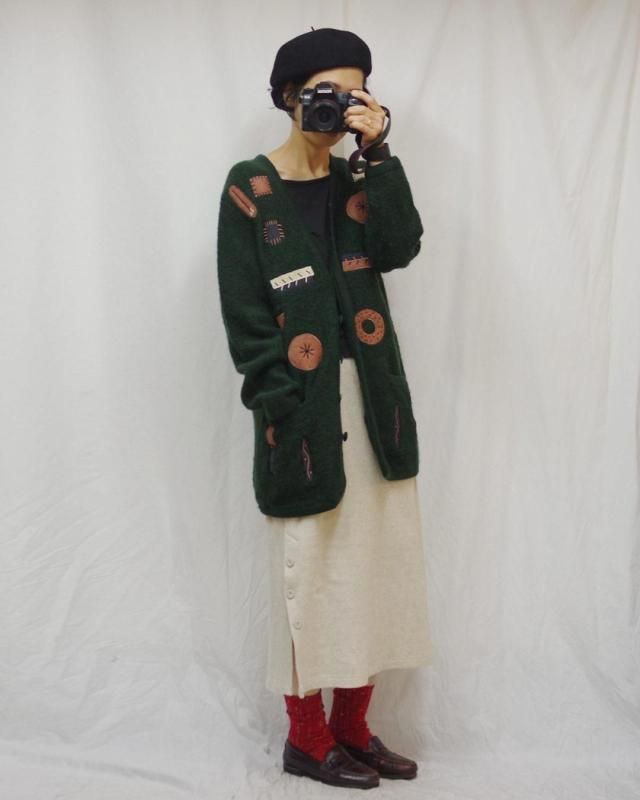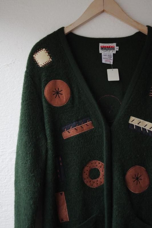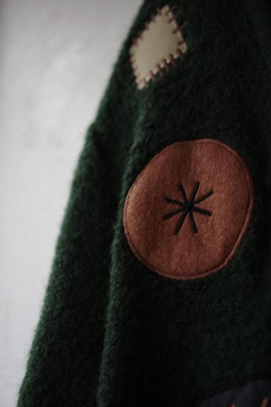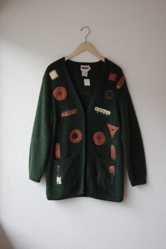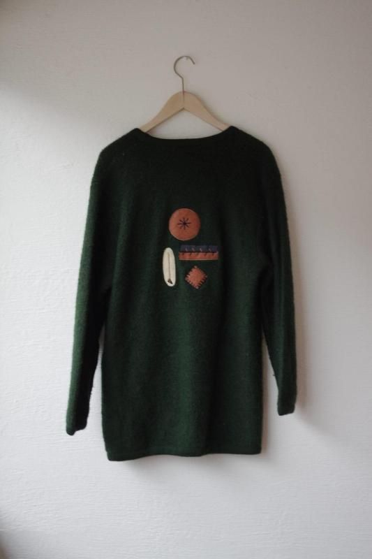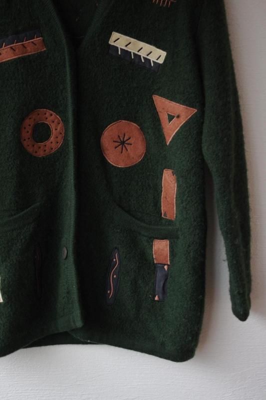パンのようなドーナツのようなアップリケが面白いウールのカーディガン。